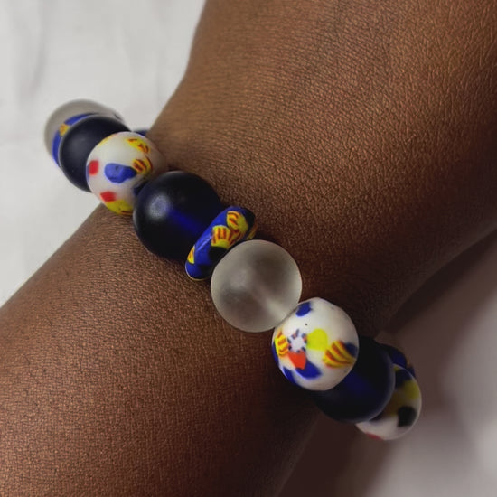 Heritage Bloom fusiona la vibrante tradición con la modernidad. Con cuentas de vidrio de un intenso azul rey, círculos blancos esmerilados y cuentas Krobo multicolores con toques de amarillo, rojo y azul, este diseño es audaz y equilibrado. Cada elemento refleja movimiento, cultura y ritmo creativo.